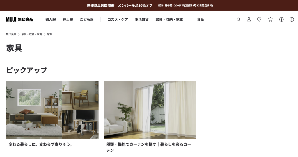 ・無印良品週間。無印良品メンバー全品10%オフ。オンラインでは3/31(火)まで!
